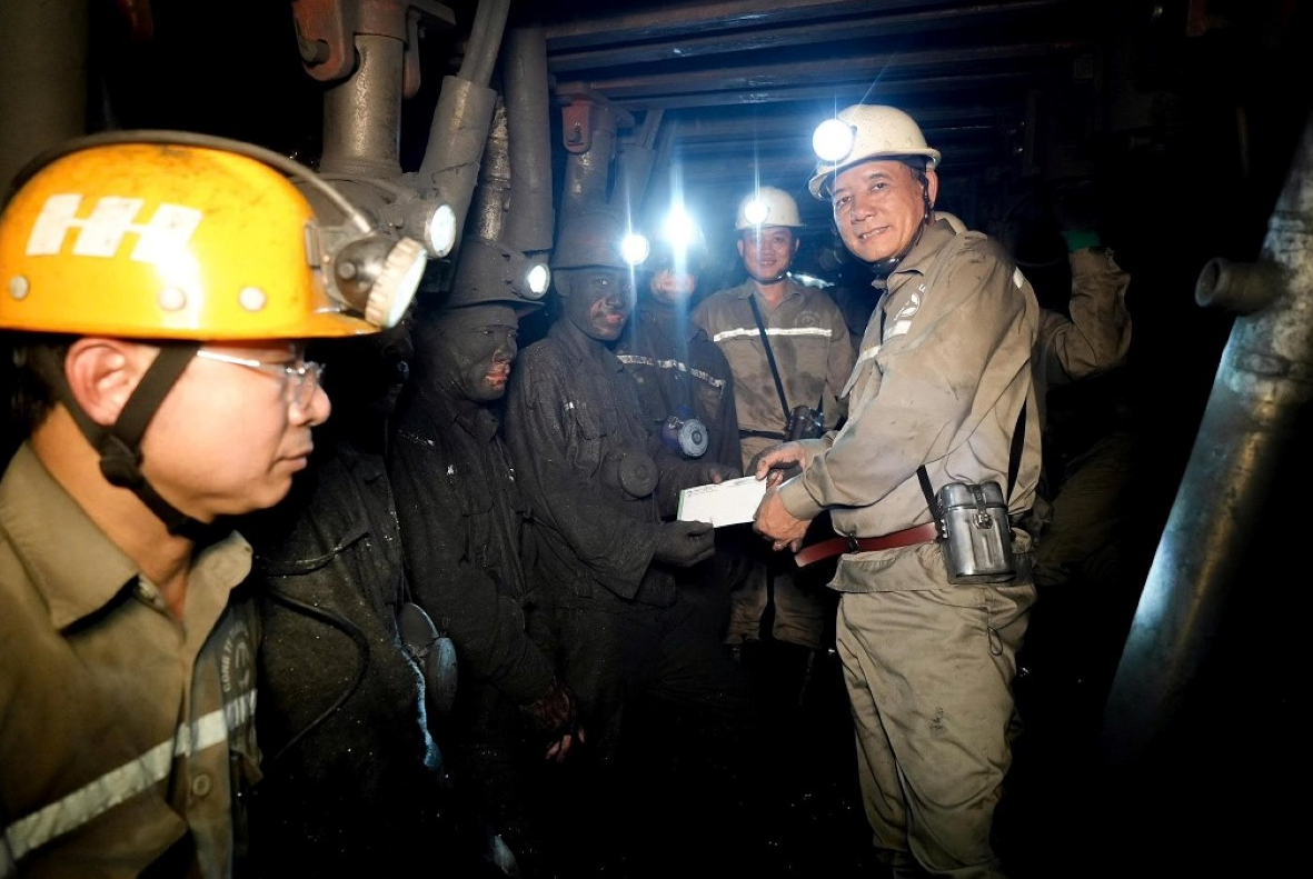 Lãnh đạo Công ty Than Hạ Long thăm, động viên thợ lò đang khai thác than trong hầm lò. Ảnh: Công ty Than Hạ Long