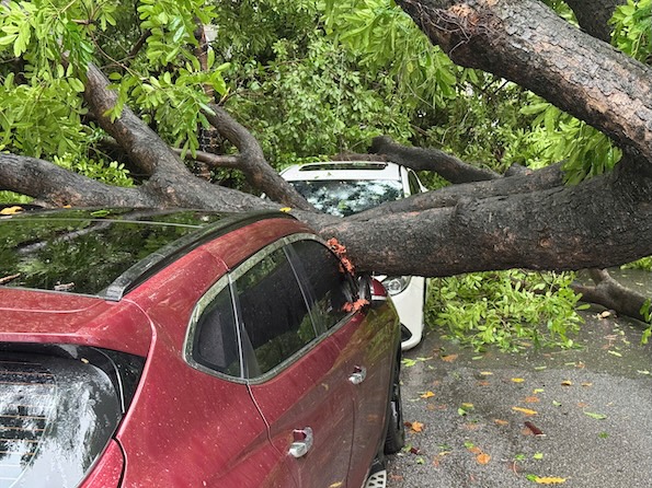Hiện trường cây gãy đổ đè lên 2 xe ô tô tại Hà Nội