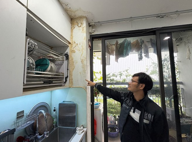 Anh Sơn cho biết, anh đã đề nghị bảo dưỡng rất nhiều lần. Cách đây 2 năm, có người vào sửa chữa, nhưng không giải quyết được tình trạng bị ngấm, thậm chí sau đó còn trầm trọng hơn. Theo anh Sơn, vừa qua có nhiều đợt mưa lớn, khiến tình trạng ngấm nước càng thêm nặng nề.