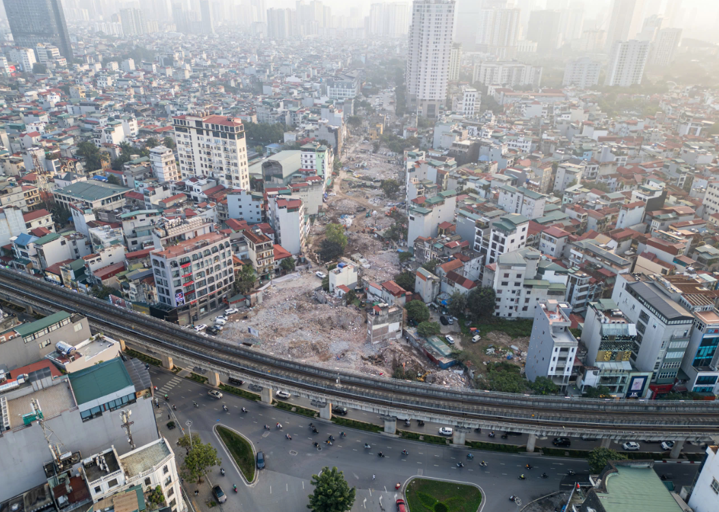 Nhìn từ trên cao, phần lớn các công trình trong phạm vi dự án đã được phá dỡ, tạo mặt bằng sạch. Đơn vị thi công đang tích cực, khẩn trương phá dỡ các công trình còn lại.