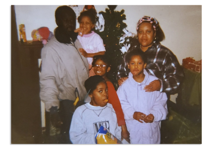 | Gia đình Amy trước khi chị em cô bị đưa vào trung tâm nuôi dưỡng. Từ trái sang: Shanaaka, Kay K và Angelia. |