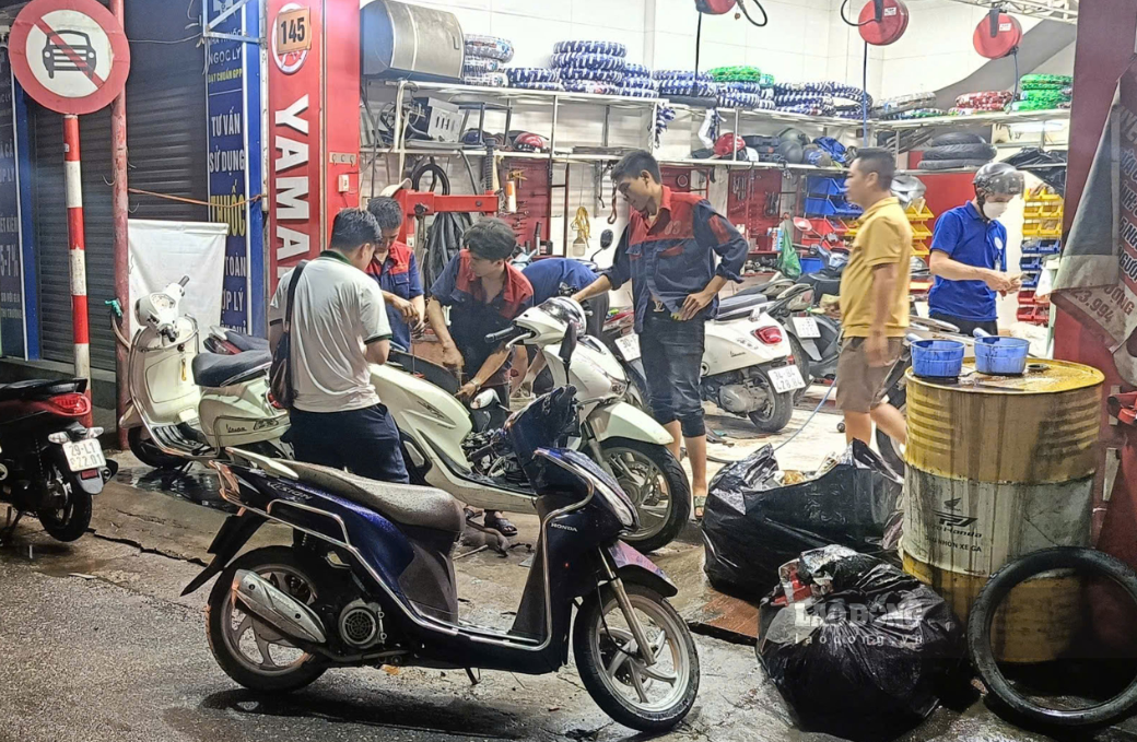 Đêm 30.9, rạng sáng 1.10, nhiều người dân vẫn đang mắc kẹt ở các điểm ngập. Không kiên nhẫn đợi được nước rút, nhiều người đi xe máy cố gắng lội nước dắt xe để tìm đường trở về nhà. Các cửa hàng sửa xe cũng làm việc xuyên đêm để phục vụ nhu cầu của người dân.