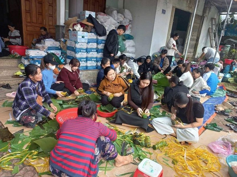 Người dân xã Trà Bồng gói bánh chưng, bánh tét gửi đến các điểm bị ảnh hưởng nặng bởi mưa lũ ở tỉnh Đắk Lắk. Ảnh: Viên Nguyễn