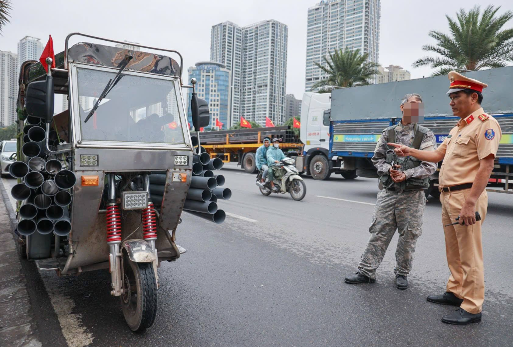 Theo đó, vào chiều 31/10, trong quá trình tuần tra, kiểm soát trên tuyến phố Trần Hưng Đạo, tổ công tác của Đội CSGT đường bộ số 1 - Phòng CSGT (Công an TP Hà Nội) phát hiện một người đàn ông điều khiển xe ba bánh tự chế chở nhiều thanh sắt hộp dài, gây cản trở và tiềm ẩn nguy cơ mất an toàn giao thông nên đã tiến hành dừng xe kiểm tra.