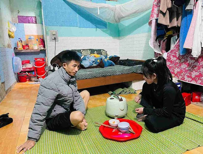 Vợ chồng anh Lò Văn Xương ngồi trong phòng trọ chật hẹp, chờ nồi măng luộc chín để chuẩn bị bữa cơm tối. Ảnh: Mai Hương
