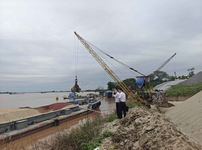 Tổ công tác tiến hành kiểm tra khu vực bến bãi ven sông Hồng tại Km78, địa phận xã Vạn Xuân (tỉnh Hưng Yên), phát hiện bến tập kết vật liệu xây dựng của ông Phạm Quang K (sinh năm 1969, trú tại xã Vạn Xuân) có một phương tiện thủy nội địa mang số đăng ký TH-1649 đang neo đậu, bốc xếp hàng hóa từ phương tiện lên bãi.