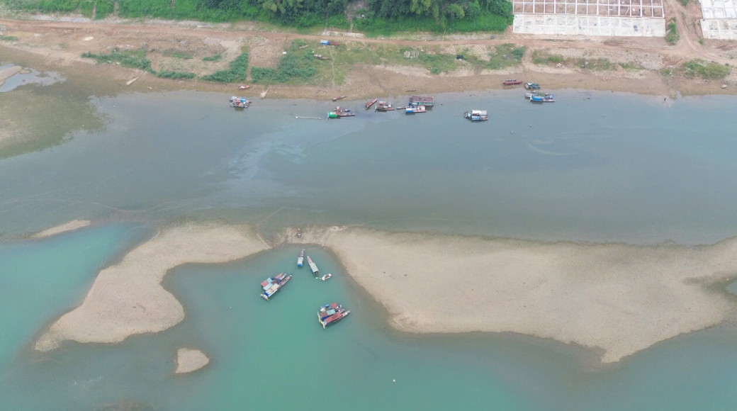 Sông Đà cạn nước giữa mùa mưa, để lộ nhiều cồn cát dưới chân thủy điện