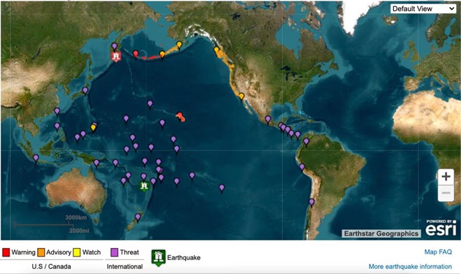 Động đất 8,7 độ richter ở Kamchatka gây sóng thần, cảnh báo sóng thần ở một loạt nước. Ảnh: NOAA