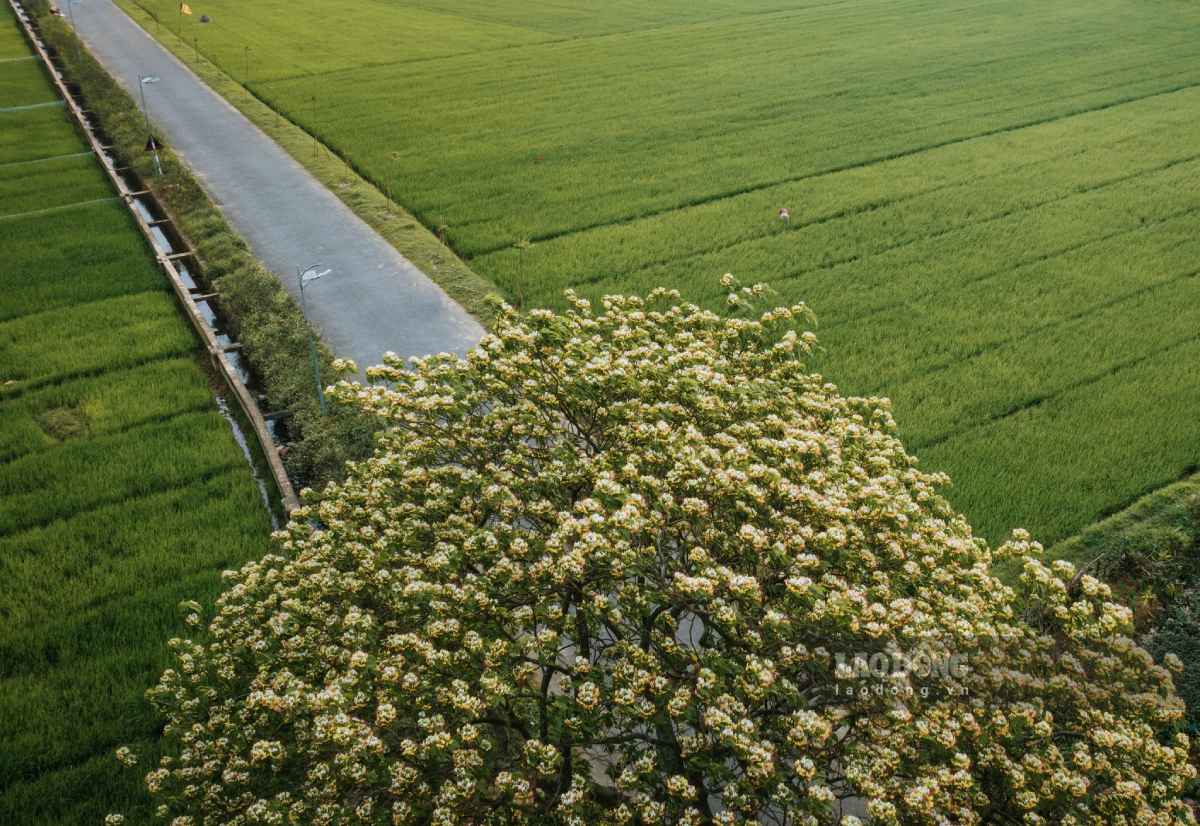 Từ trên cao nhìn xuống, cây hoa bún hiện lên như một mâm xôi khổng lồ, nổi bật giữa thảm lúa xanh mướt.
