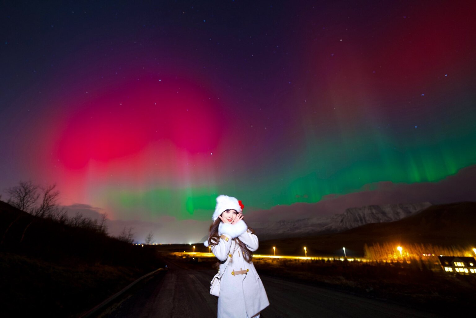 Một du khách Việt Nam chụp hình lưu niệm với hiện tượng cực quang đỏ cực hiếm tại Iceland. Những dải ánh sáng xanh, hồng và tím rực rỡ trên bầu trời đêm. Ảnh: Kevin Phan