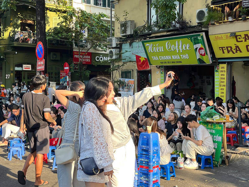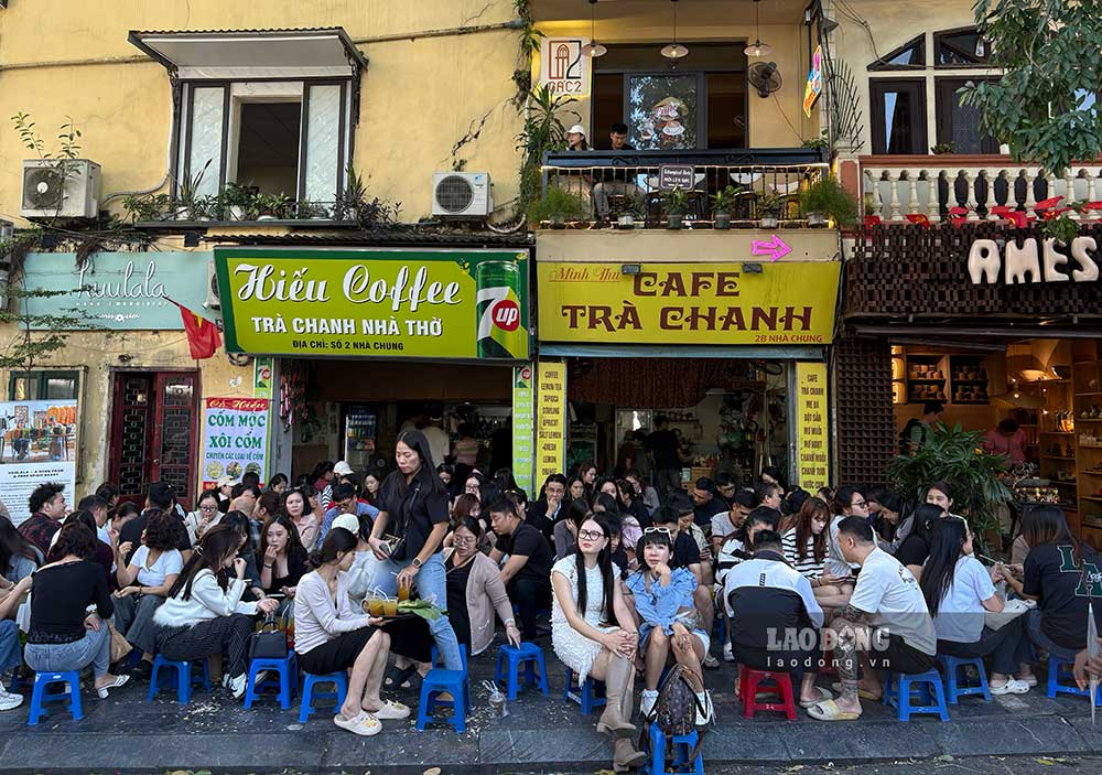 Nhà thờ Lớn Hà Nội tấp nập khách check in, uống trà chanh, cà phê... tận hưởng những ngày đẹp trời khi không khí lạnh tràn về. Ảnh: Chí Long