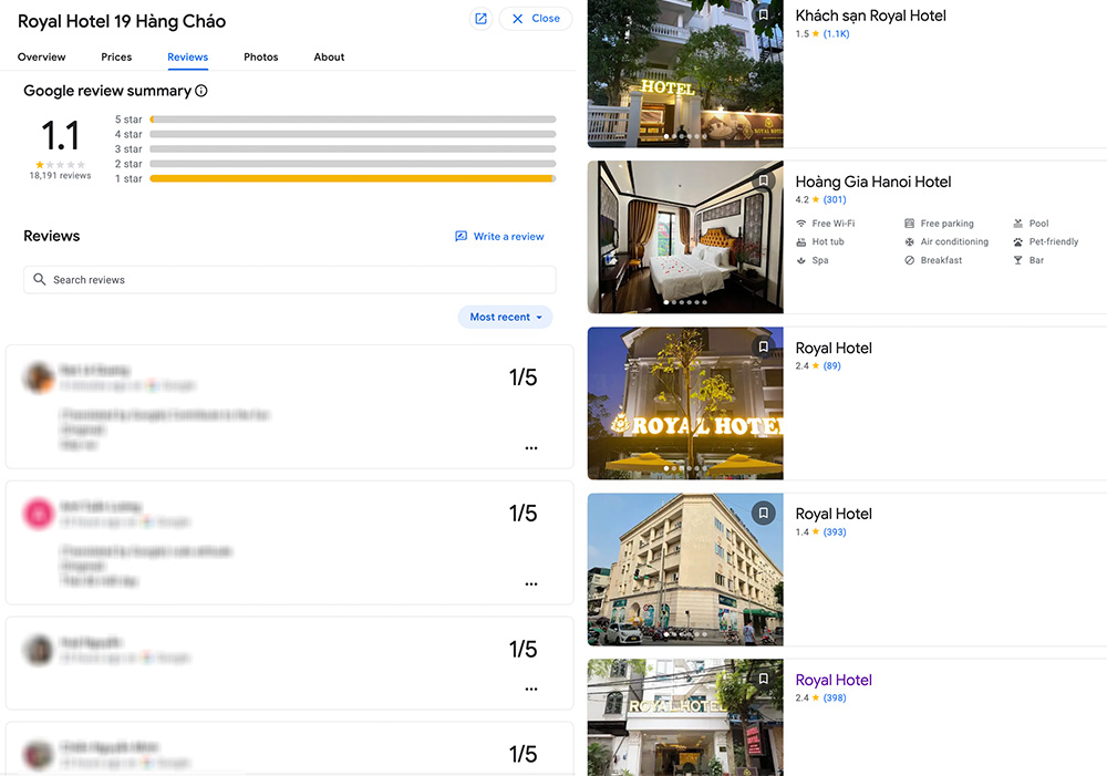 Khách sạn Royal Hotel trên phố Hàng Cháo nhận hàng chục nghìn lượt đánh giá 1 sao trên Google Maps (trái). Nhiều khách sạn có tên tương tự (phải) nhận “bão 1 sao“, cùng hàng trăm bình luận chê dịch vụ kém. Ảnh chụp từ ứng dụng