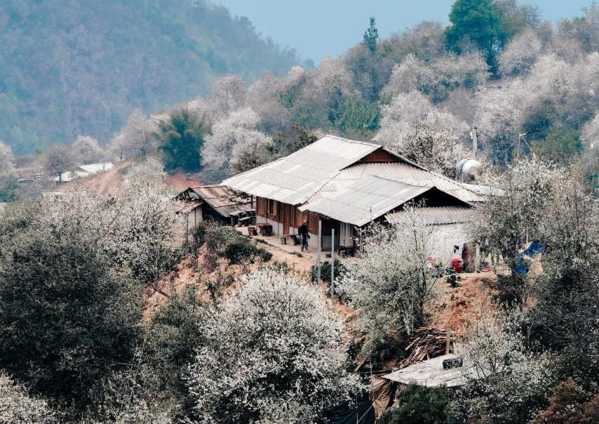 Sơn La - Tháng 3 về, hoa sơn tra nhuộm trắng những con đường quanh co, những mái nhà đơn sơ của bản Nậm Nghẹp đẹp mơ màng, thu hút du khách gần xa.