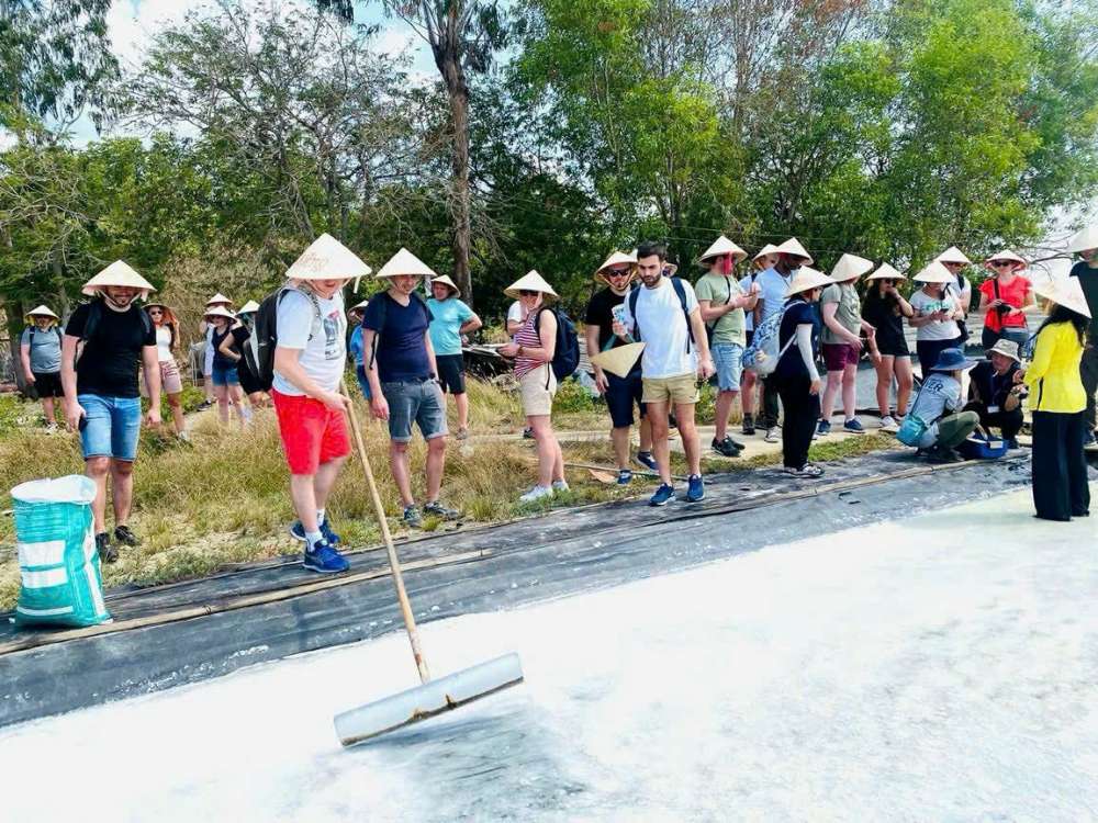 Ghi nhận thực tế tại ấp đảo, không khó để bắt gặp hình ảnh những đoàn khách hào hứng xắn quần lội ruộng, tay cầm cào, vai gánh muối dưới cái nắng chói chang. Dù mồ hôi nhễ nhại, nhưng ai nấy đều cười tươi rói khi được tận tay chạm vào "hạt ngọc trời".