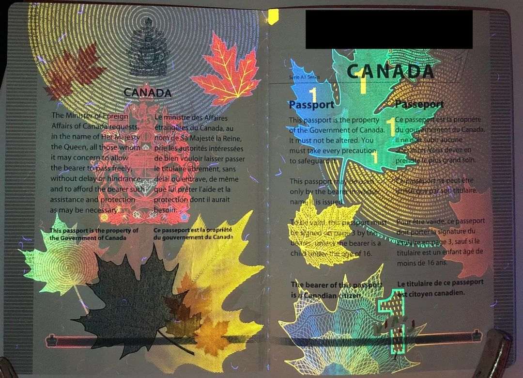 Hộ chiếu Canada soi dưới đèn UV. Ảnh: Nadams20/Reddit