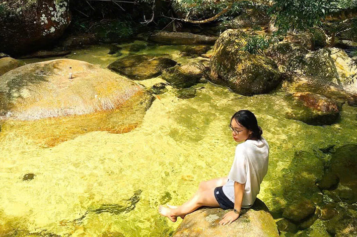 Nước ở Thác Ba Tia mang sắc vàng đặc trưng, trong veo, có thể nhìn rõ những viên đá dưới lòng suối. Ảnh: Thu Hoài
