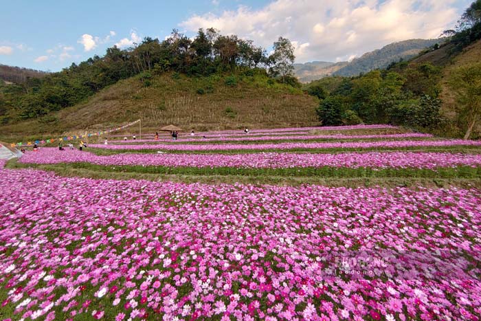 Cách trung tâm phường Điện Biên Phủ gần 60km, theo ghi nhận, hàng vạn bông hoa cánh bướm đủ màu sắc từ trắng, hồng đến tím đang độ khoe sắc thắm nhất, trải dài trên những thửa ruộng vốn trước đây chỉ trồng lúa.