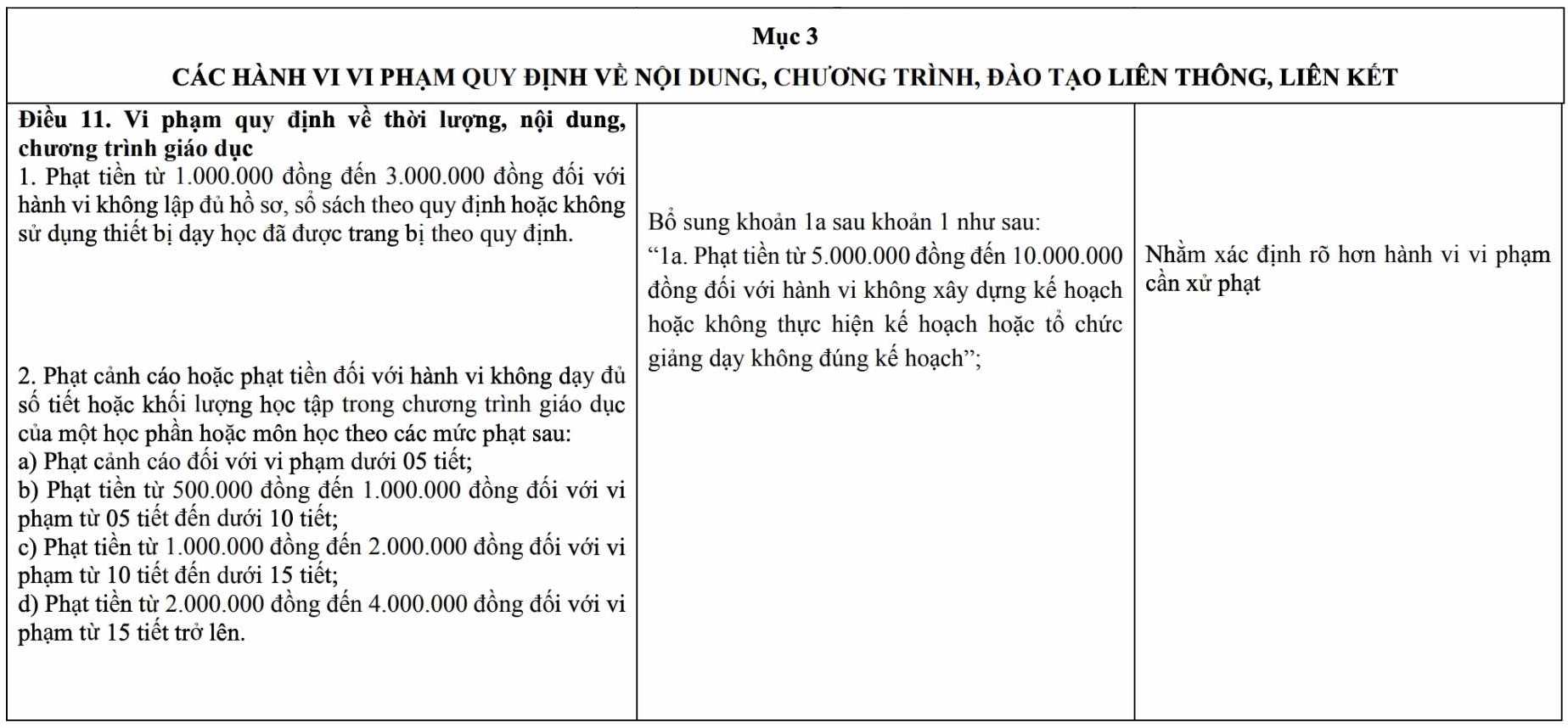Về hành vi vi phạm quy định về thời lượng, nội dung, chương trình giáo dục, Bộ GDĐT đề xuất bổ sung mức phạt đối với hành vi không xây dựng kế hoạch hoặc không thực hiện kế hoạch hoặc tổ chức giảng dạy không đúng kế hoạch. Bộ GDĐT cho biết, điều này nhằm xác định rõ hơn hành vi vi phạm cần xử phạt.