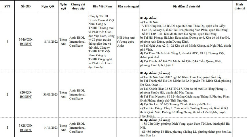 Bộ GD&ĐT công bố danh sách đơn vị được phê duyệt liên kết tổ chức thi cấp chứng chỉ năng lực ngoại ngữ của nước ngoài.