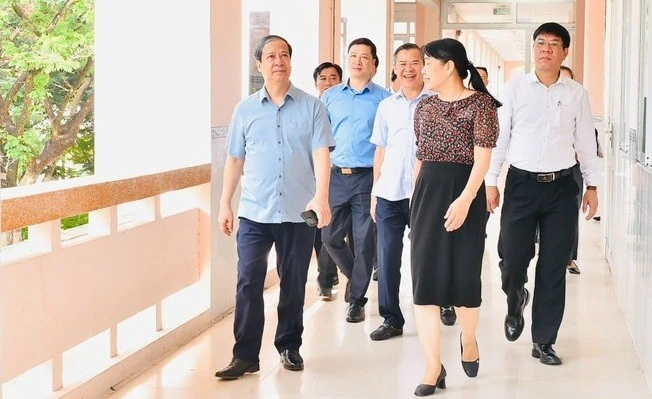 Bộ trưởng Nguyễn Kim Sơn và đoàn công tác kiểm tra công tác chuẩn bị cho Kỳ thi tốt nghiệp THPT năm 2024 tại Hậu Giang. Ảnh: MOET |