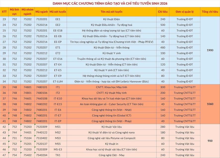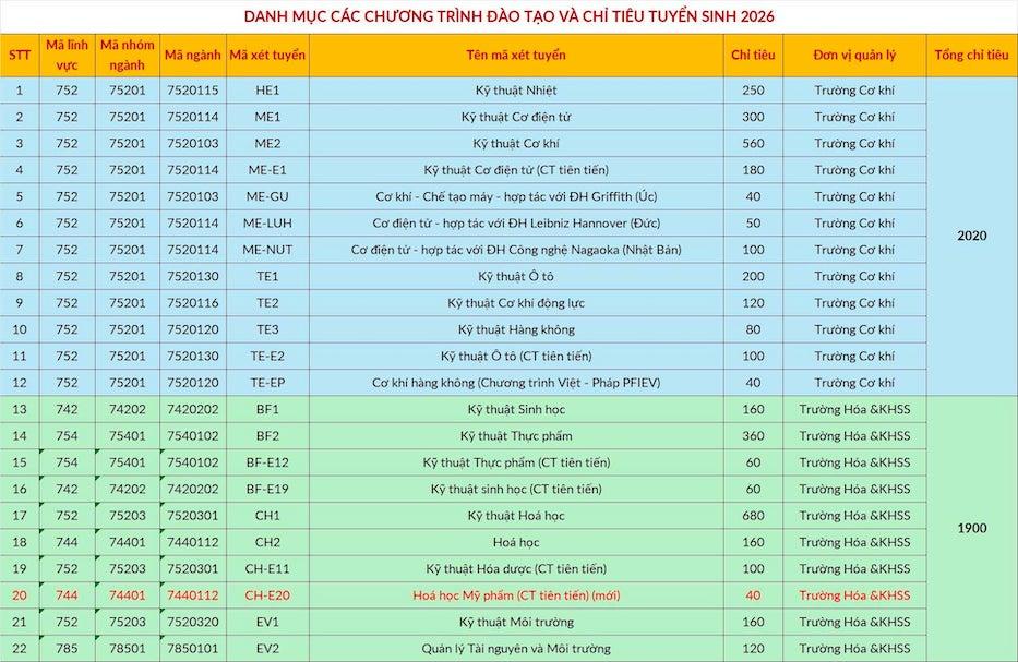 Danh mục các chương trình đào tạo, chỉ tiêu, phương thức và mã xét tuyển vào Đại học Bách khoa Hà Nội năm 2026.