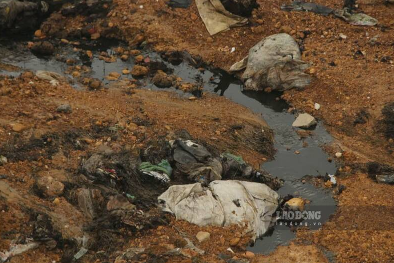 Ghi nhận PV ngày 19.4, bãi rác sinh hoạt nằm lộ thiên, chất cao như núi. Rác thải ngập ngụa bốc mùi hôi thối nồng nặc. Dòng nước thải đen kịt từ bãi rác ảnh hưởng đến môi trường xung quanh.