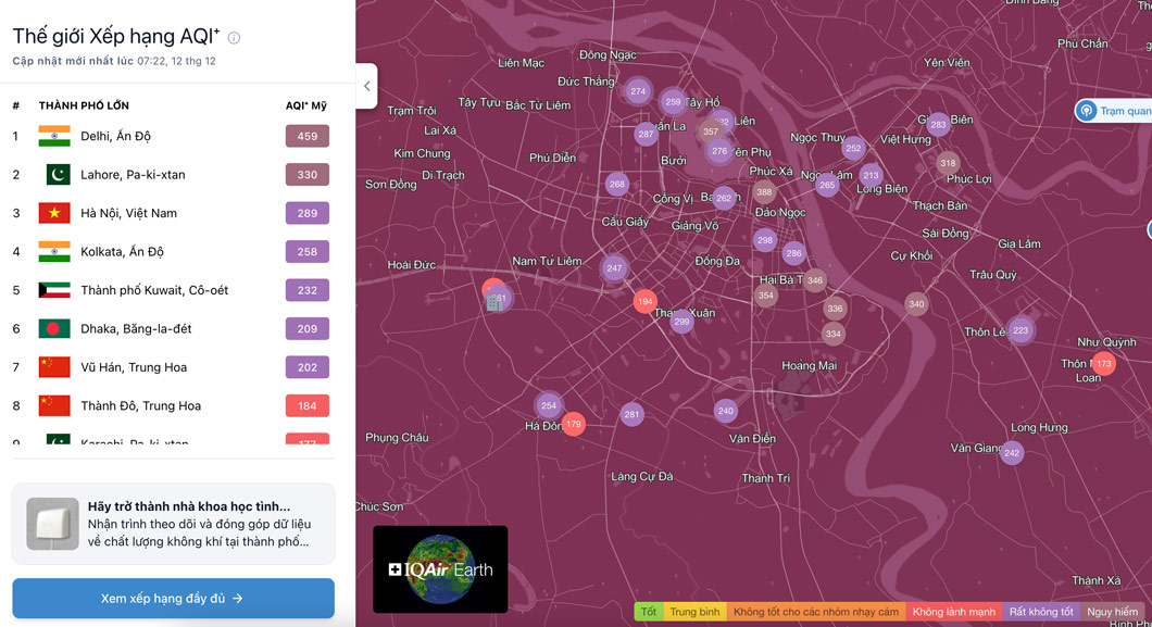 Theo Ứng dụng đo chỉ số ô nhiễm không khí IQAir, lúc 7h20 sáng nay, IQAir xếp Hà Nội là thành phố ô nhiễm thứ 3 trên thế giới với chỉ số AQI là 289 - rất không tốt cho sức khỏe.