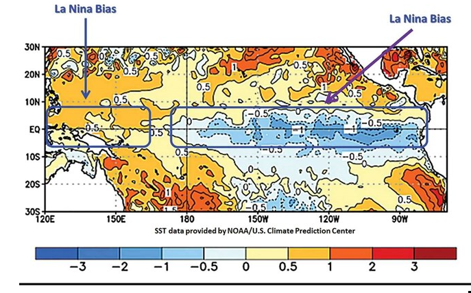 La Nina hiện vẫn hiện diện, nhưng đã xuất hiện nhiều dấu hiệu suy yếu. Trong vài tuần gần đây, nước ấm dưới tầng sâu đại dương liên tục gia tăng và bắt đầu lan sang phía đông Thái Bình Dương.