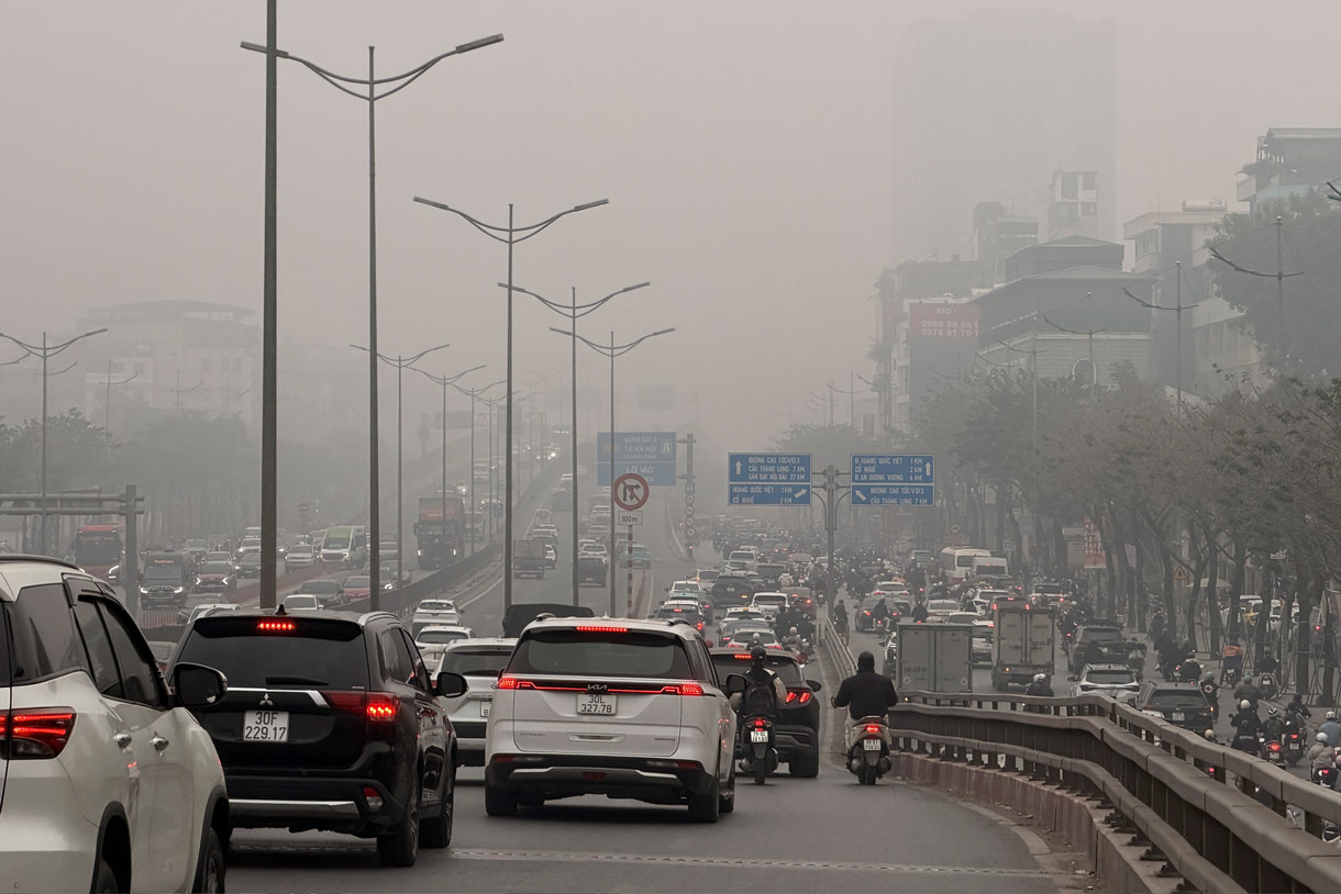 Ghi nhận lúc 9h sáng nay tại đường Phạm Văn Đồng, không khí ô nhiễm mù mịt, che khuất tầm nhìn của các phương tiện tham gia giao thông. Ảnh: Việt Anh