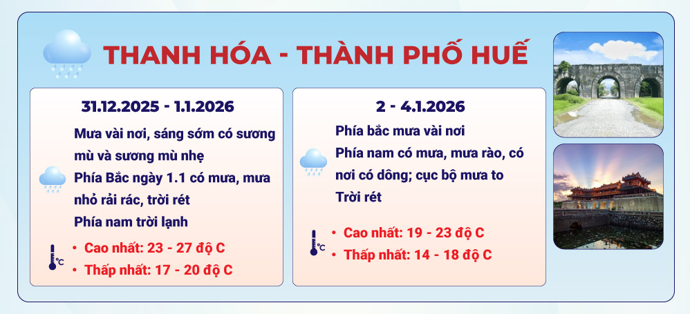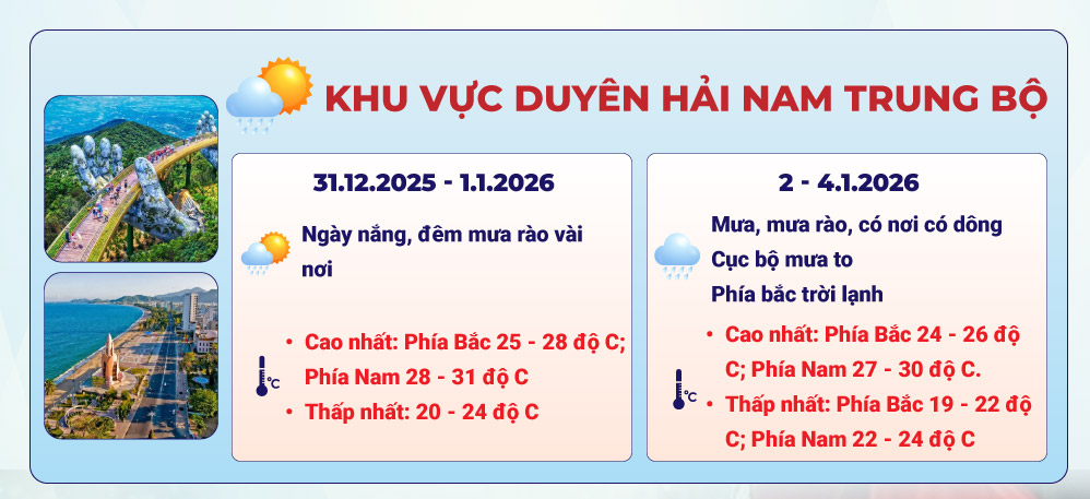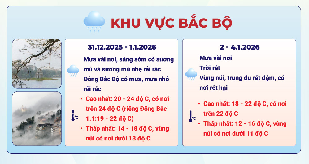 Dự báo từ ngày 2.1.2026, khả năng không khí lạnh tăng cường khiến nền nhiệt miền Bắc giảm, duyên hải Nam Trung Bộ có mưa.