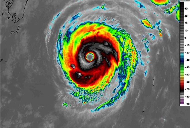 Mắt bão Hạ Long rõ nét, bao quanh bởi mây đối lưu cực mạnh. Ảnh: Weathernerds.org