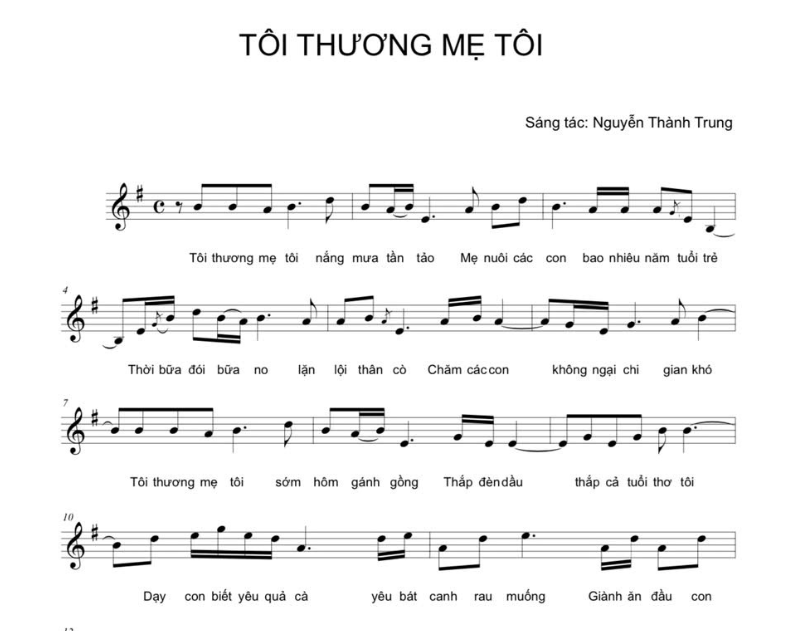 Câu kết, giai điệu rơi nhẹ về tông thấp, như một tiếng lòng chan chứa “Tôi thương mẹ tôi”. Cấu trúc khúc thức tự sự mở rộng, giai điệu liền bậc, ít nhảy xa quãng rộng để tạo sự liền lạc, nối tiếp tự nhiên giữa các nốt, tạo không gian mơ màng từ đó giúp bài hát không bị khô cứng, mà mềm mại, thủ thỉ, giống như một hành trình từ hồi ức tuổi thơ đến sự ngộ ra, biết ơn tình mẹ khi trưởng thành, rất phù hợp với dòng nhạc dân ca trữ tình.