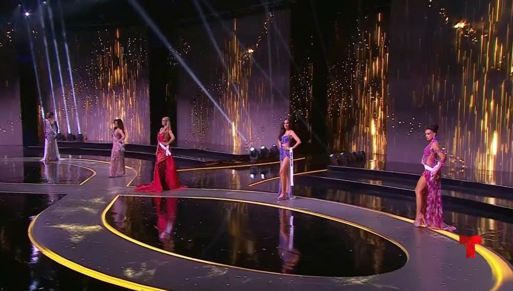 11h47: Các thí sinh bước vào phần thi trang phục dạ hội. Mỗi nhóm gồm 5 người đẹp trình diễn lần lượt.