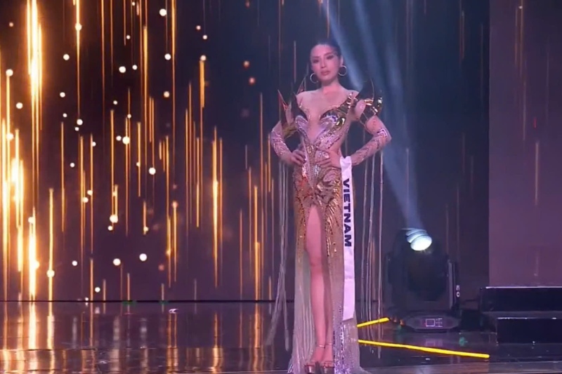 10h27: Đại diện Việt Nam - Hoa hậu Kỳ Duyên diện thiết kế trang phục dân tộc gồm áo Nhật Bình, điểm xuyết họa tiết cánh bướm, đính đá. Đạo cụ của cô là chiếc lọng cầm tay, khi bung mở sẽ mô phỏng hình ảnh "nhộng hóa bướm”.