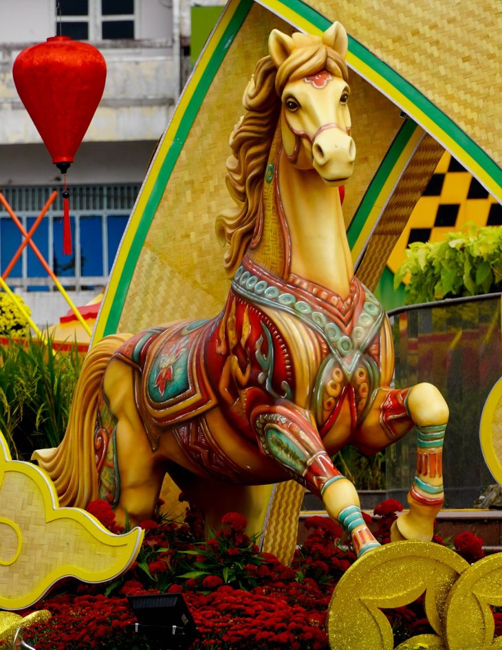 Điểm nhấn của linh vật năm nay là hệ thống hoa văn được thể hiện trực tiếp trên thân ngựa. Những đường viền nổi kết hợp gam màu vàng, đỏ, xanh tạo hiệu ứng thị giác nổi bật nhưng vẫn hài hòa với tổng thể.