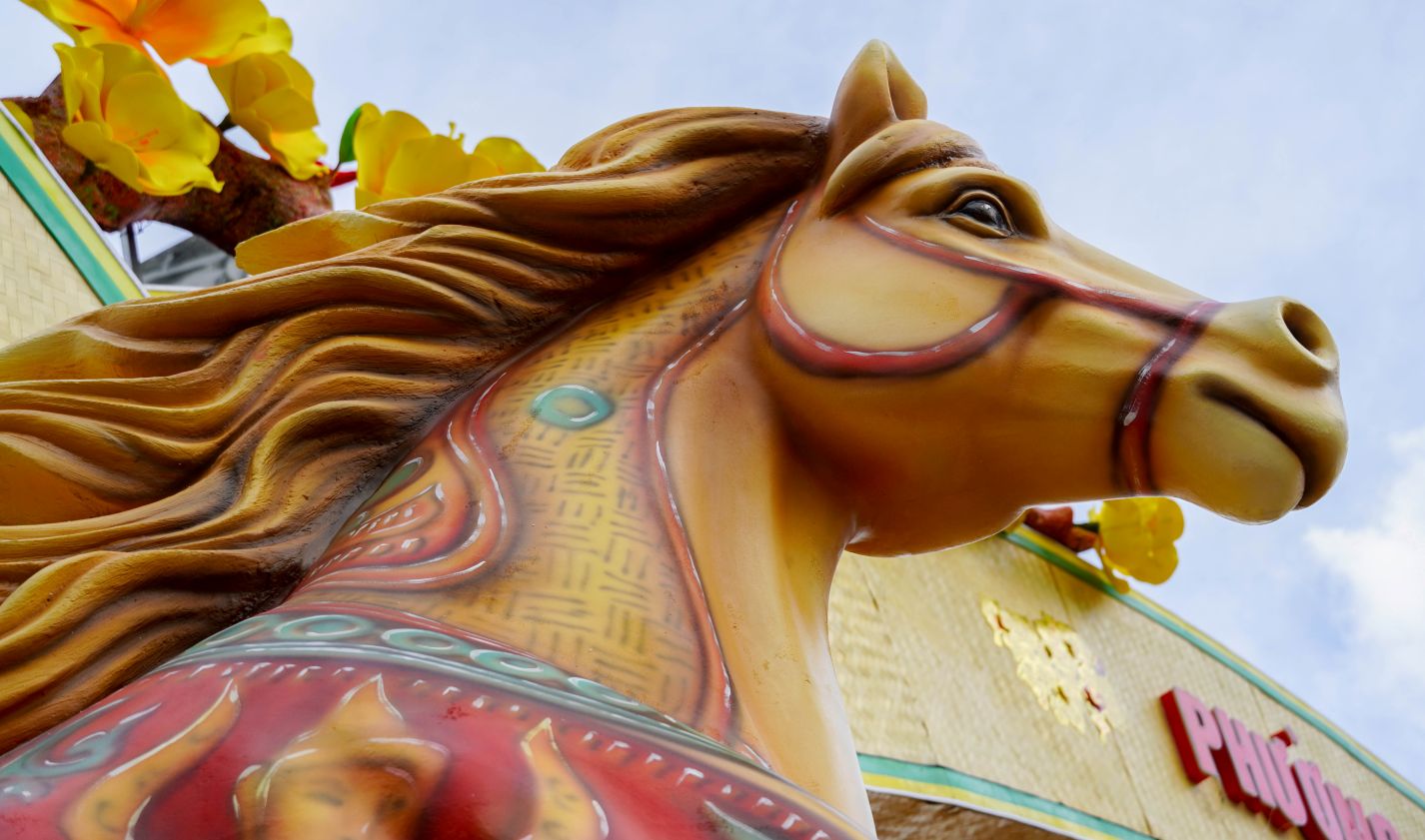 Hai linh vật ngựa cao hơn 2 mét, tạo thế vươn mình mạnh mẽ, tượng trưng cho tinh thần bứt phá trong năm mới.
