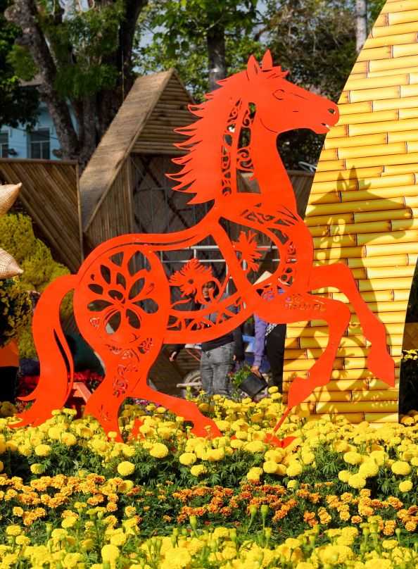 Điểm nhấn tại khu vực này là hai linh vật ngựa được thiết kế theo phong cách đơn giản, không quá cầu kỳ về hoa văn nhưng nổi bật với gam màu đỏ chủ đạo – sắc màu tượng trưng cho may mắn và tài lộc trong dịp đầu năm. Tạo hình gọn gàng, đường nét rõ ràng giúp linh vật dễ quan sát từ xa, phù hợp với không gian quảng trường rộng mở.