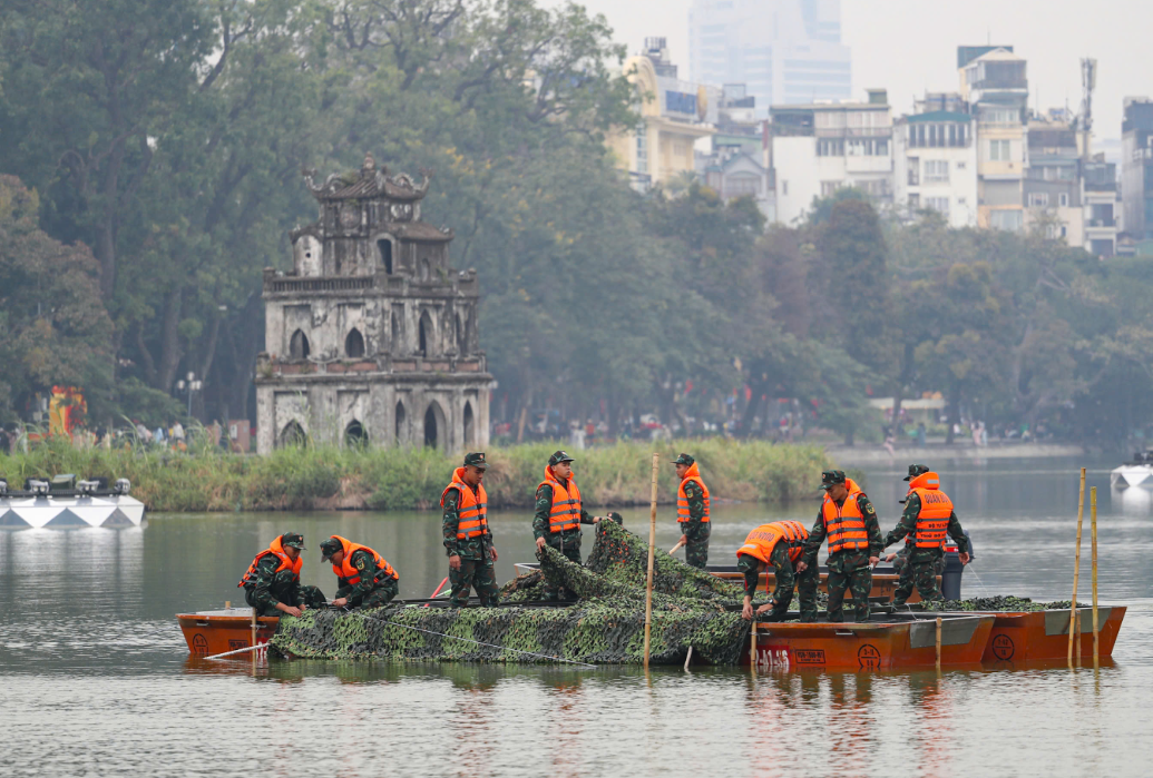 Theo ghi nhận của Lao Động ngày 30.12, tại trận địa pháo hoa khu vực hồ Hoàn Kiếm, cán bộ, chiến sĩ Ban chỉ huy Phòng thủ khu vực 3 - Hồng Hà (Bộ Tư lệnh Thủ đô Hà Nội) đã hoàn tất lắp đặt hệ thống ống phóng.