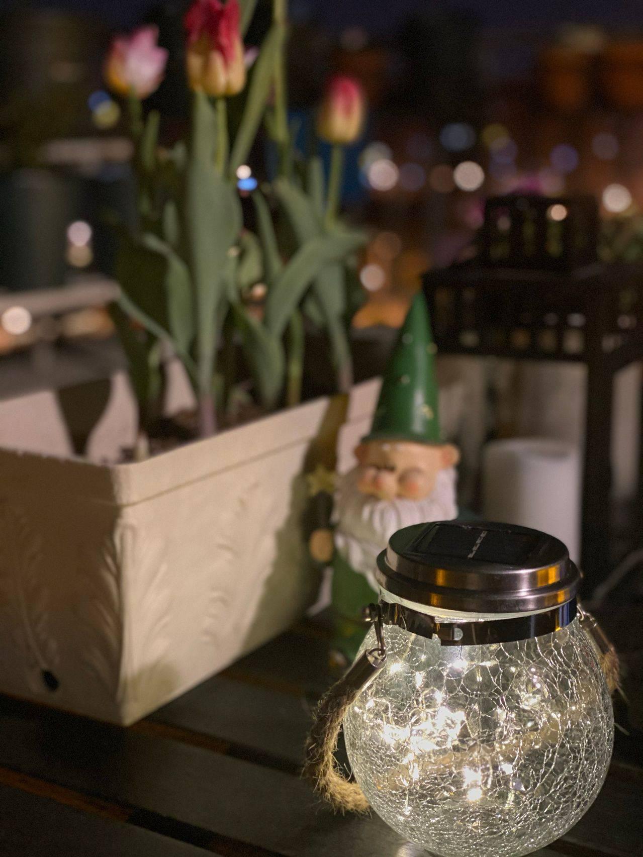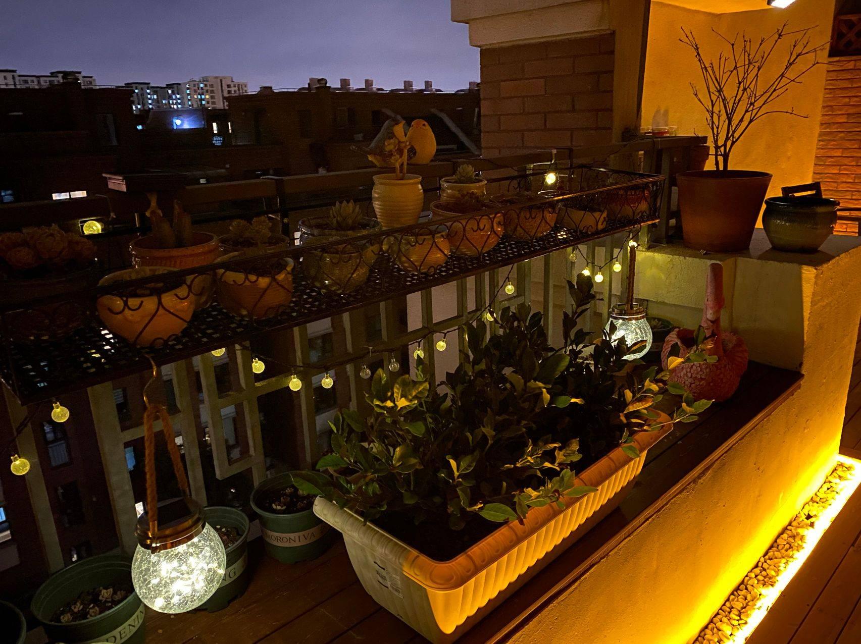 Toàn bộ đèn trang trí trong khu vườn đều được chị Chi lựa chọn loại sử dụng năng lượng mặt trời, vừa tiết kiệm điện lại có tuổi thọ sử dụng lâu dài. Sự góp mặt của những dải đèn trang trí khi màn đêm buông xuống góp phần tạo ra bầu không khí lãng mạn bên trong khu vườn.