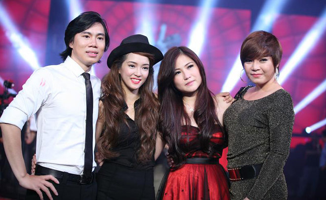 Top 4 Giọng hát Việt 2012, từ trái qua: Kiên Giang, Đinh Hương, Hương Tràm và Lê Xuân Nghi. Ảnh BTC