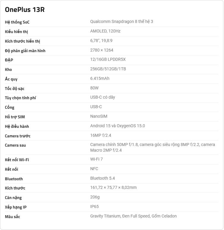 OnePlus 13R kế thừa dòng Ace 5 với thiết kế hiện đại màn hình OLED 68 inch Snapdragon 8 Gen 3 pin 6415mAh camera 50MP hiệu năng mạnh mẽ giá cả hấp dẫn