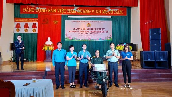 Nhân dịp kỷ niệm 75 năm Ngày Thương binh - Liệt sĩ (27.7.1947- 27.7.2022), ngày 26.7, được sự ủy quyền của Lãnh đạo Bộ, đoàn công tác của Công đoàn Bộ VHTTDL đã đến thăm, tặng quà tri ân và biểu diễn chương trình nghệ thuật đặc biệt phục vụ các thương binh, bệnh binh và cán bộ, viên chức, người lao động của Trung tâm Điều dưỡng người có công tỉnh Phú Thọ.