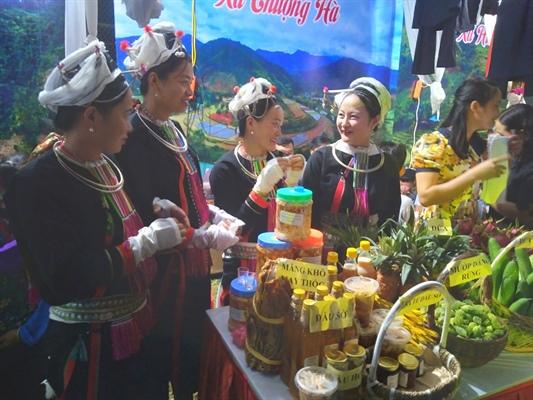 Các cô gái dân tộc Sán Chỉ giới thiệu các sản phẩm tiêu biểu của địa phương tại đêm áp phiên chợ tình Phong lưu