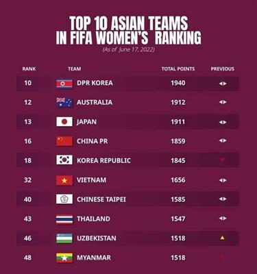 Tại bảng xếp hạng các đội tuyển bóng đá nữ tháng 6.2022 của Liên đoàn bóng đá thế giới (FIFA), đội tuyển nữ Việt Nam vẫn giữ được vị trí 32 thế giới, hạng 6 châu Á và số 1 Đông Nam Á.