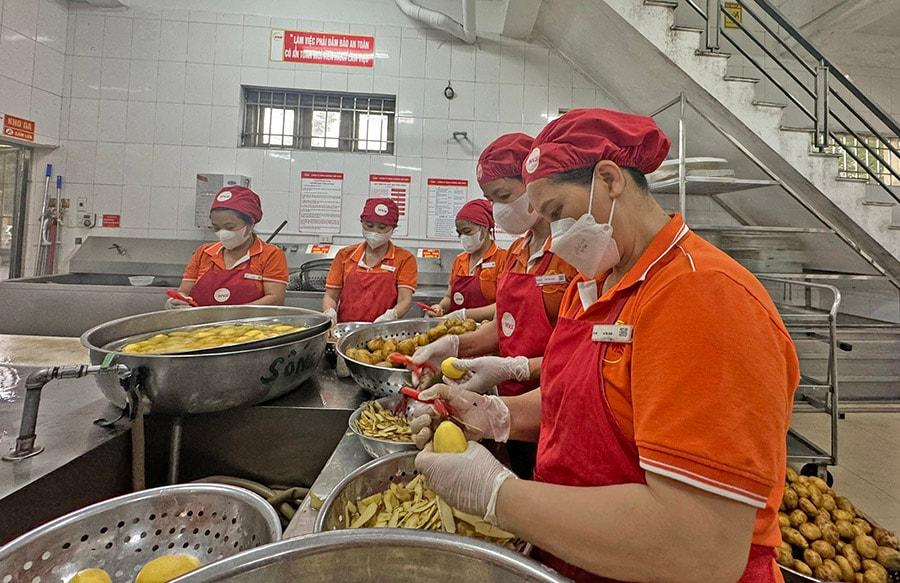 Chuẩn bị bữa trưa cho học sinh tại bếp ăn của Trường Tiểu học Nghĩa Tân (phường Nghĩa Đô).