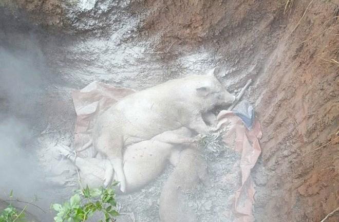 Lực lượng chức năng tiêu huỷ gia súc bị dịch tả lợn châu Phi. Ảnh: Công Sáng.