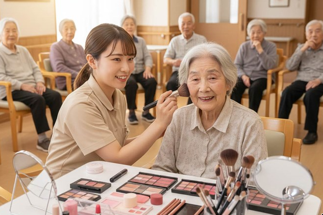 Nhiều cơ sở dưỡng lão tại Nhật Bản đưa các dịch vụ chăm sóc sắc đẹp như dưỡng da, trang điểm vào hoạt động thường ngày.