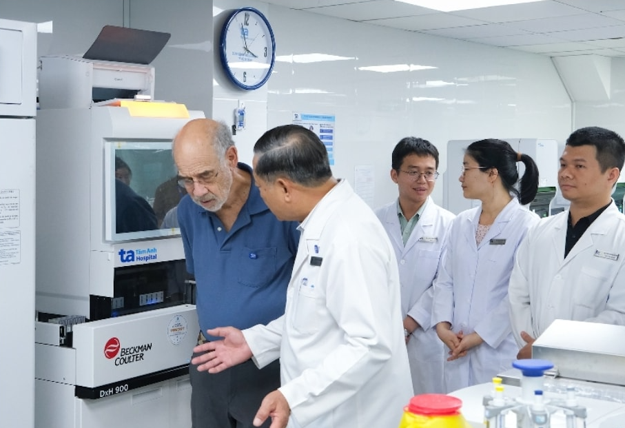 Giáo sư Harry B. Greenberg, “cha đẻ” của vắc xin Rota thế hệ đầu tiên, cố vấn Viện Nghiên cứu Vi sinh và Chống dịch Stanford (áo xanh) thăm và làm việc tại Trung tâm Xét nghiệm Bệnh viện Đa khoa Tâm Anh TP.HCM hồi tháng 12/2023. Ảnh: BVĐK Tâm Anh