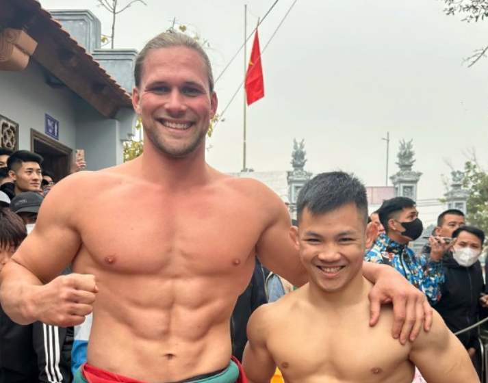 Đô vật Zakhar Dzmitrychenka (Belarus) gây sốt khi liên tục giành chiến thắng ở các hội vật làng Việt Nam đầu xuân.