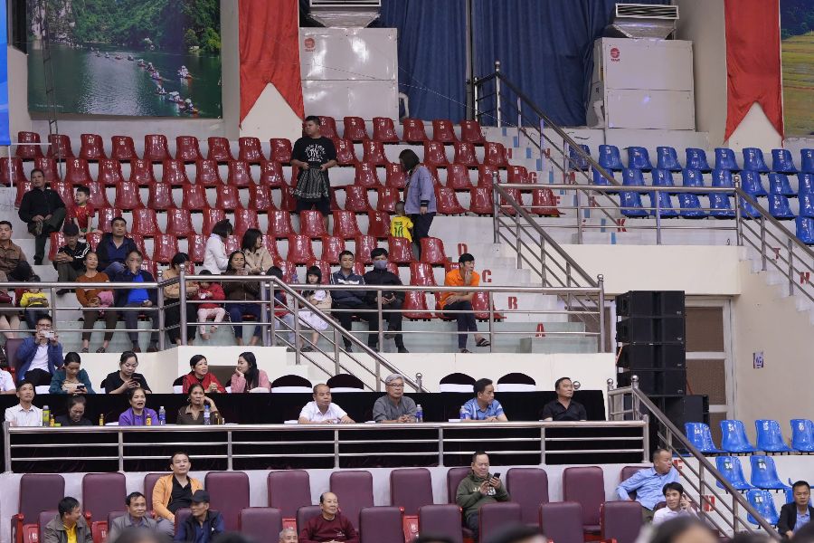 Các khán đài thưa thớt khán giả trong ngày thi đấu đầu tiên giải bóng chuyền Cúp Hoa Lư - Bình Điền 2025. Ảnh: Minh Dương